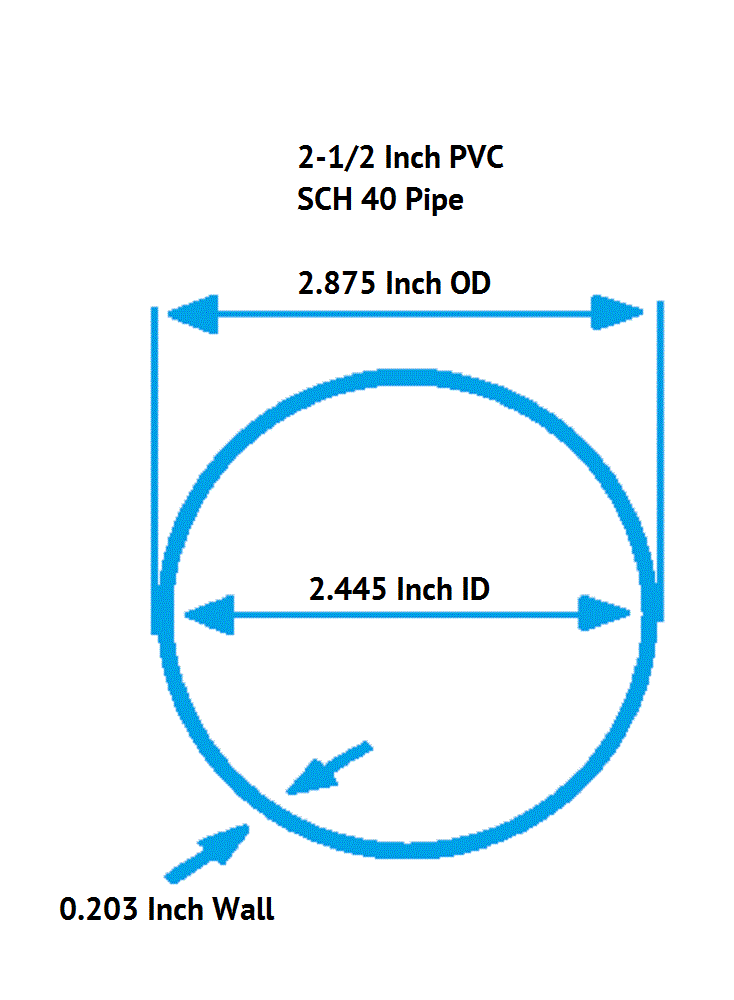 Pipe has an approximate ID of 2.445 inch and an approximate OD of 2.875 inch, per PVC Schedule 40 Specifications. As with all extruded pipe, the inside diameter can vary a little. Tolerance for the inside diameter is +/- 2% of the stated diameter.